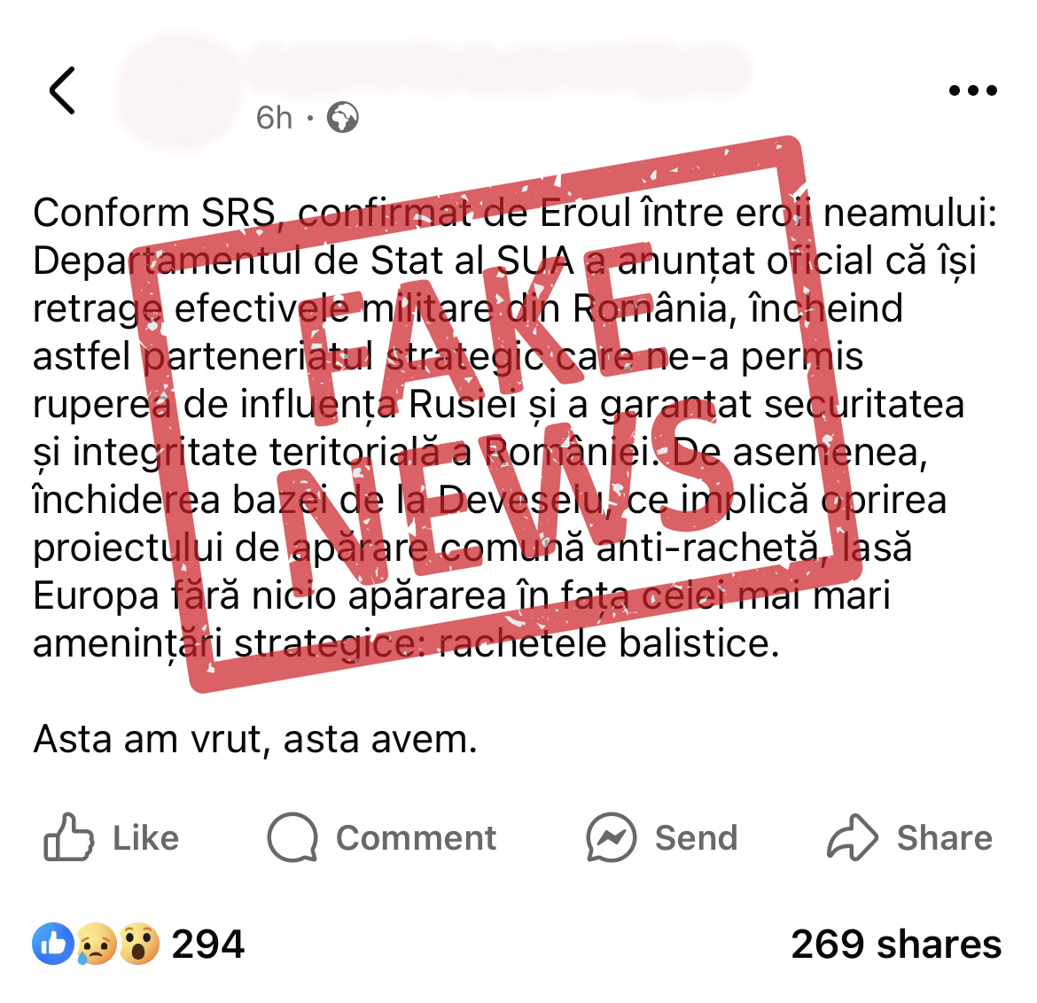 O a doua acțiune de dezinformare, distribuită pe platformele TikTok, YouTube și Facebook, face referire la așa-zise „decizii” oficiale comunicate de autoritățile SUA cu privire la retragerea totală a militarilor americani dislocați în România, inclusiv la retragerea sistemului antirachetă Aegis Ashore dislocat de Armata SUA în Baza 99 Deveselu.